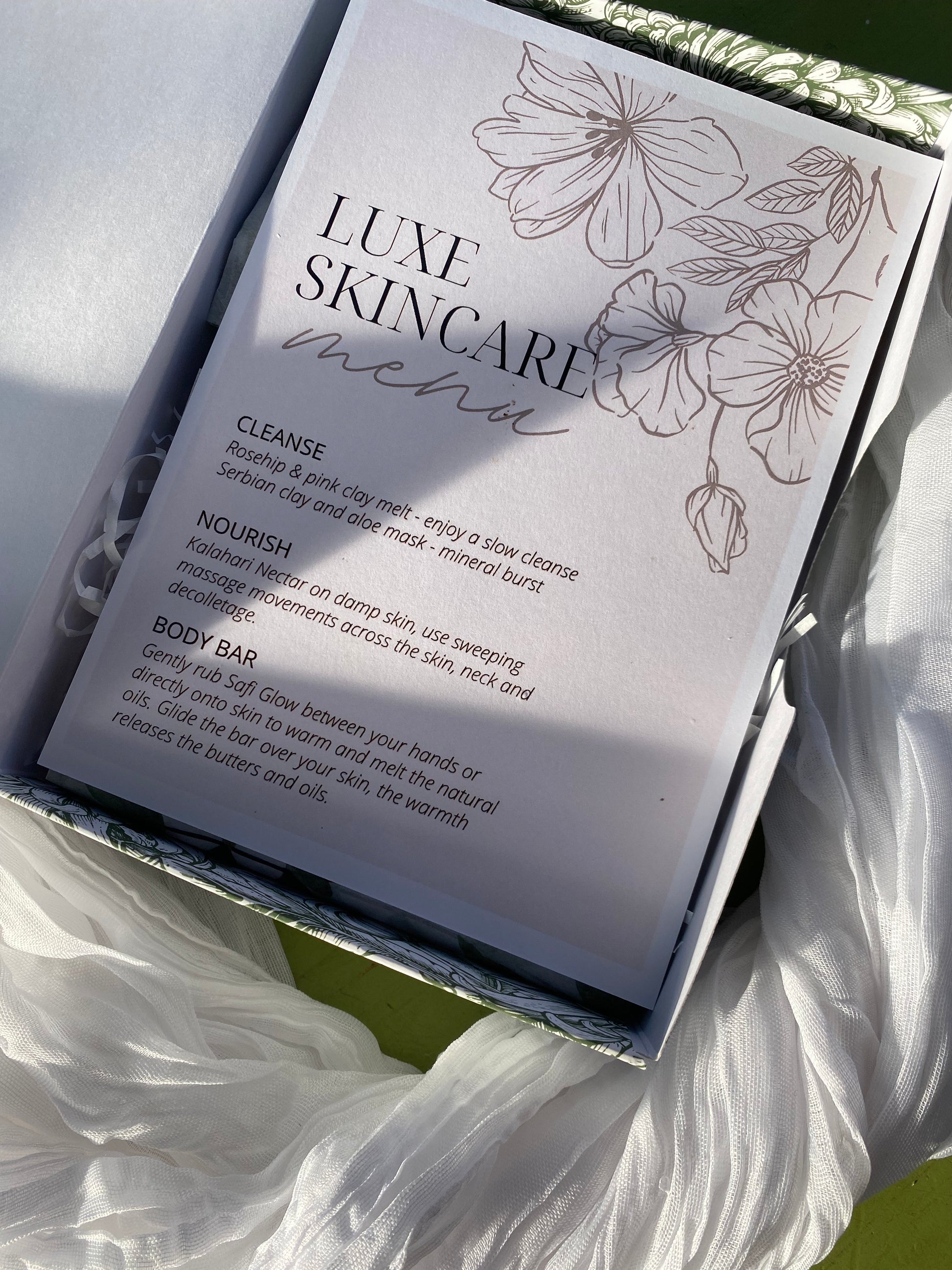 Begin your facial routine with the Rosehip and pink clay Cleanse Melt, which gently nourishes your skin barrier while cleansing. Follow with the Blue Serbian Clay and aloe vera mask, a mineral-rich, gentle treatment that boosts your skin’s health—perfect for mixing with your favourite actives like avocado, cucumber, or floral waters using the bamboo spoon. Leave the mask on for 10-15 minutes and rinse with warm water, leaving the skin damp. Finish with Kalahari Nectar, a botanical blend of African oils and extracts of Lions Mane, Carrot and Rhubarb, massaging into damp skin, to lock in moisture and leave your skin glowing.