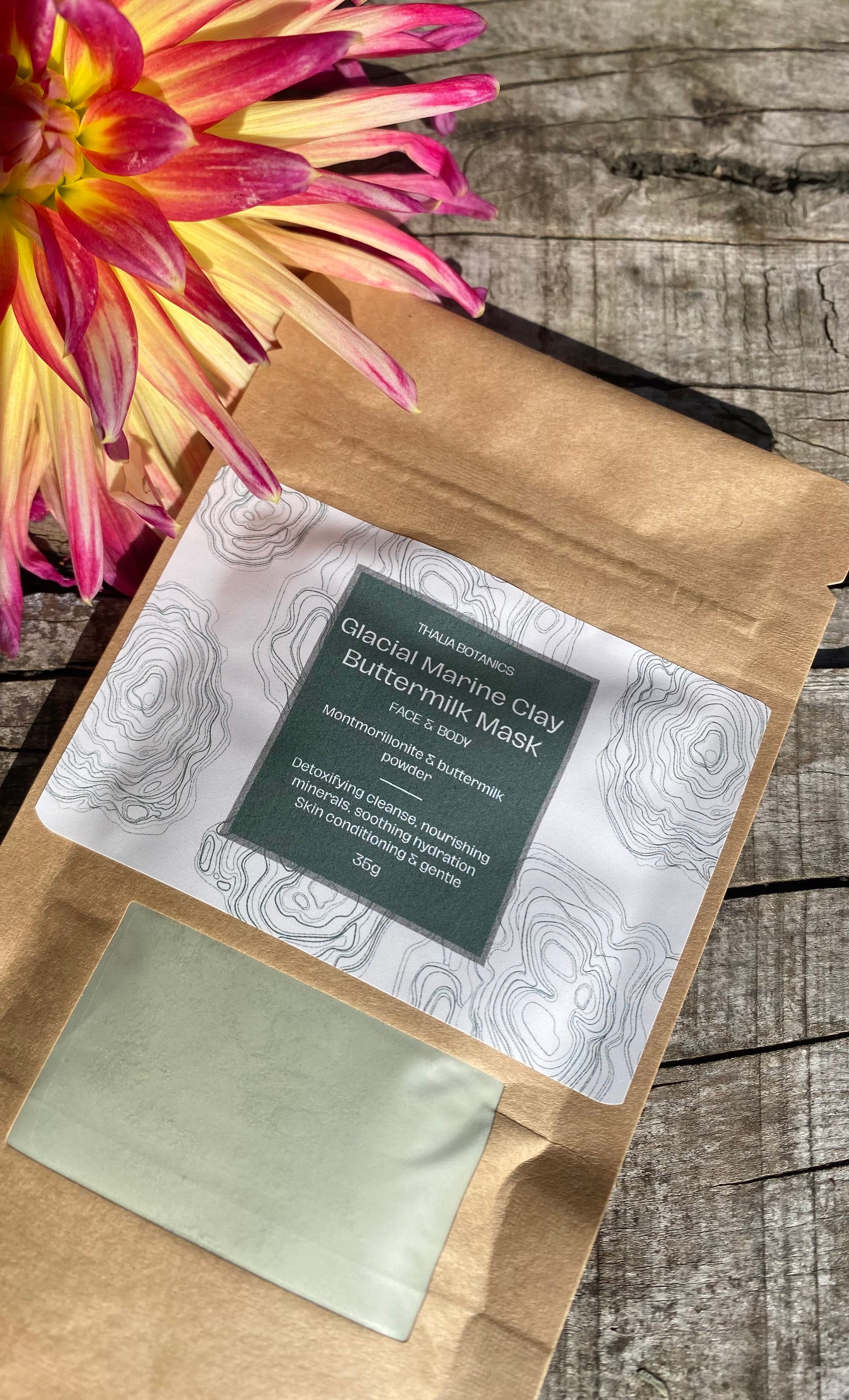 Experience the perfect harmony of mineral-rich glacial marine clay and soothing buttermilk in this luxurious mask. The glacial marine clay works to detoxify and tighten the skin, helping to draw out impurities and promote a firm, radiant complexion. Paired with nourishing buttermilk creates a beautiful synergy, buttermilk is known for its gentle exfoliating and deeply moisturizing properties, this mask leaves your skin feeling soft, refreshed, and beautifully balanced.